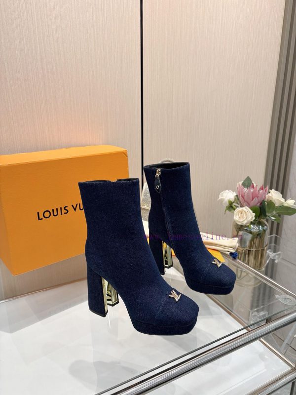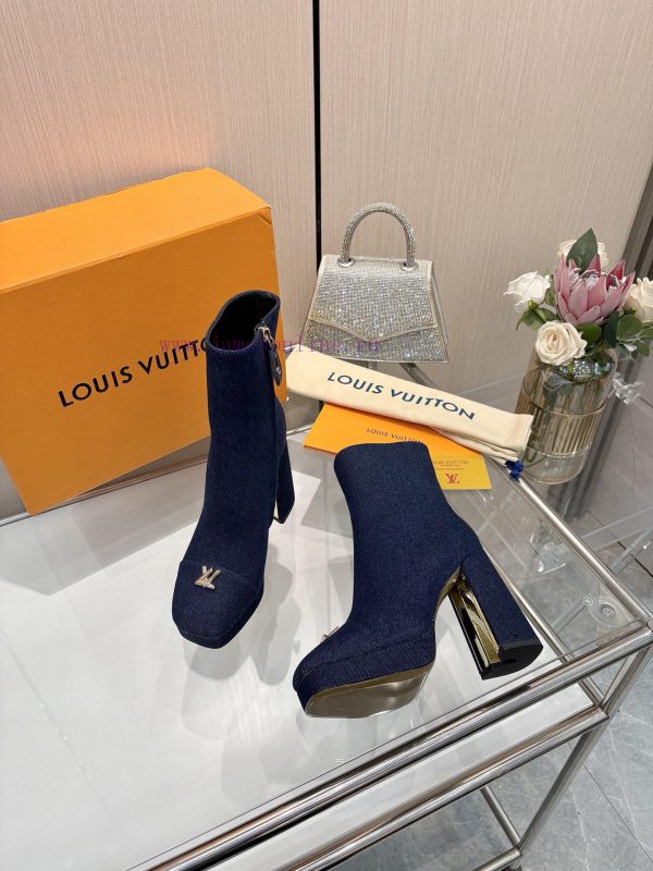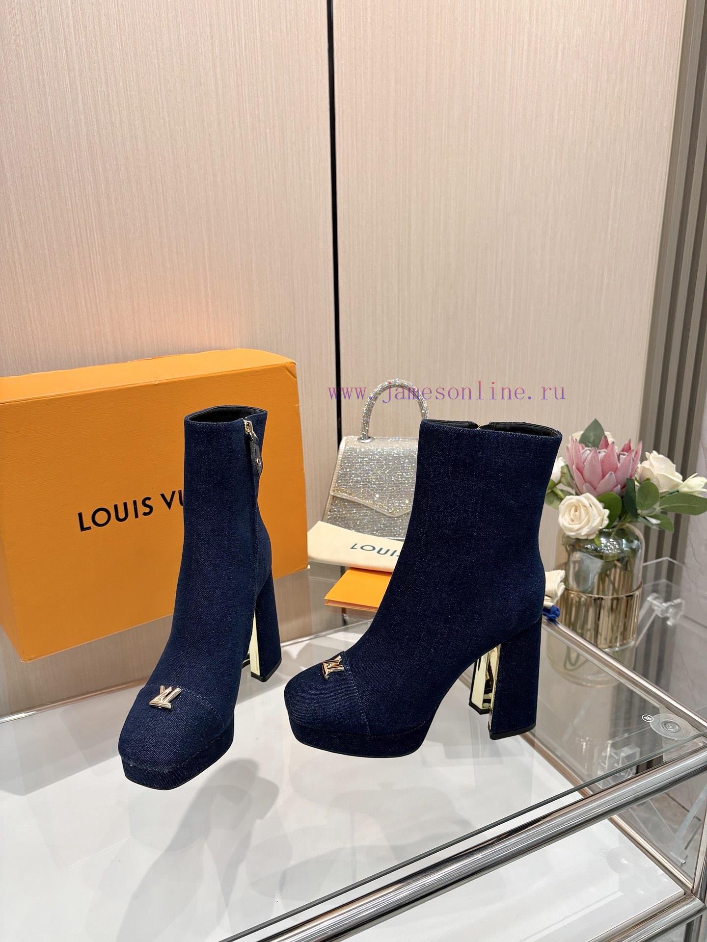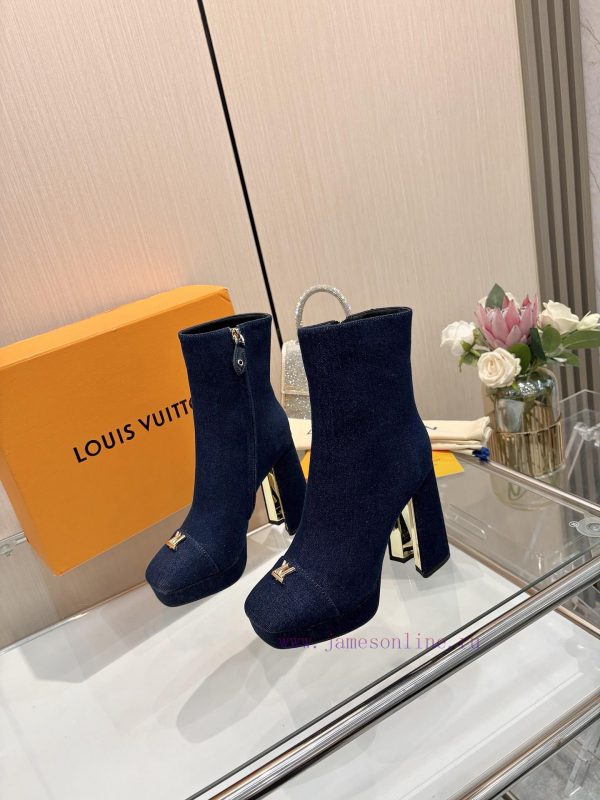 The top tier 2025 autumn/winter LV runway same style, these 6-inch water platform short boots are too tall, aren’t they11cm high heels, thick water platform, even small people can easily handle it. Walking steadily without tiring feet is really friendlyThe small V-buckle design is exquisitely crafted and perfectly replicated with the original last shape. It features an Italian genuine leather sole and imported high-end fabric with an inner zipper for easy on and offWhether paired with jeans or a dress, it can instantly enhance one’s temperament. Walking on the street, the rate of turning back is explosiveLV short boots fashion show, same high heels, niche wear, luxury wearImported calf leather/lychee pattern/distressed leather/denim fabricHigh quality soft sheepskin lining insideImported goat skin for foot padsSole Italian genuine leather soleLuxury PackagingHeel 11cm leather bag heel/2cm water table foreskin/electroplated designSize 35-4034.40.41 Customized Non refundable