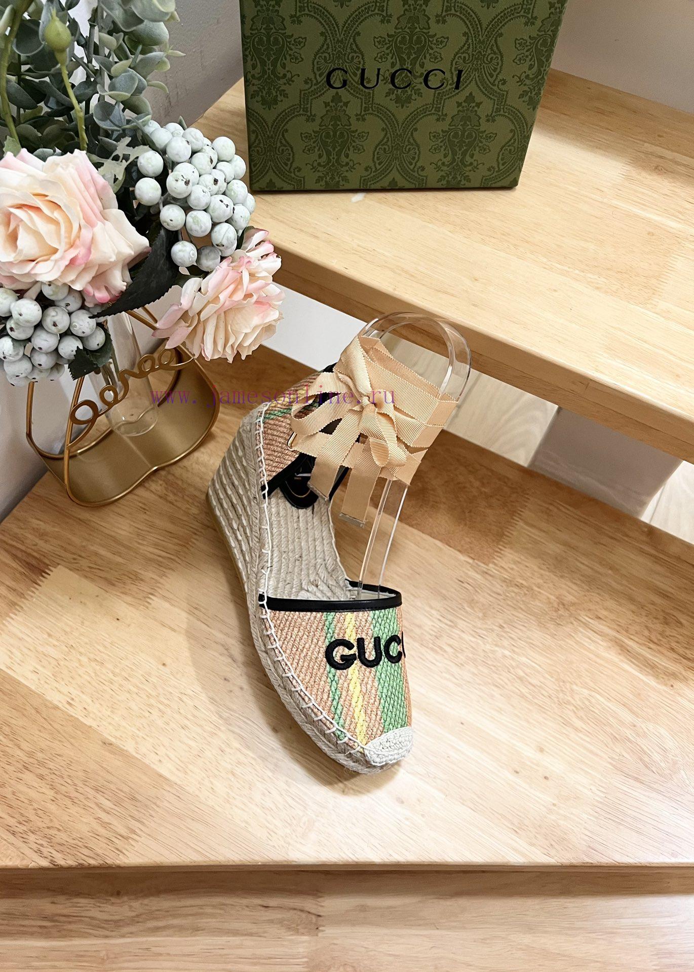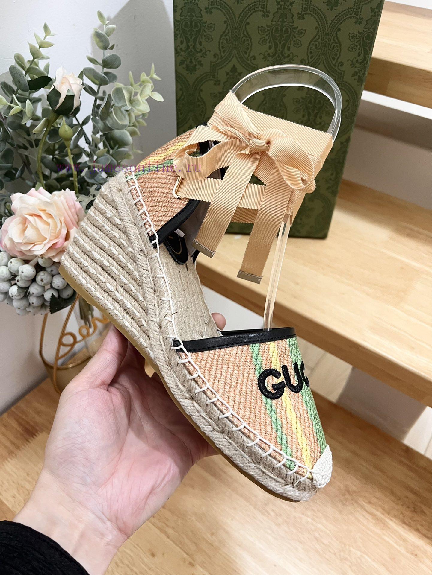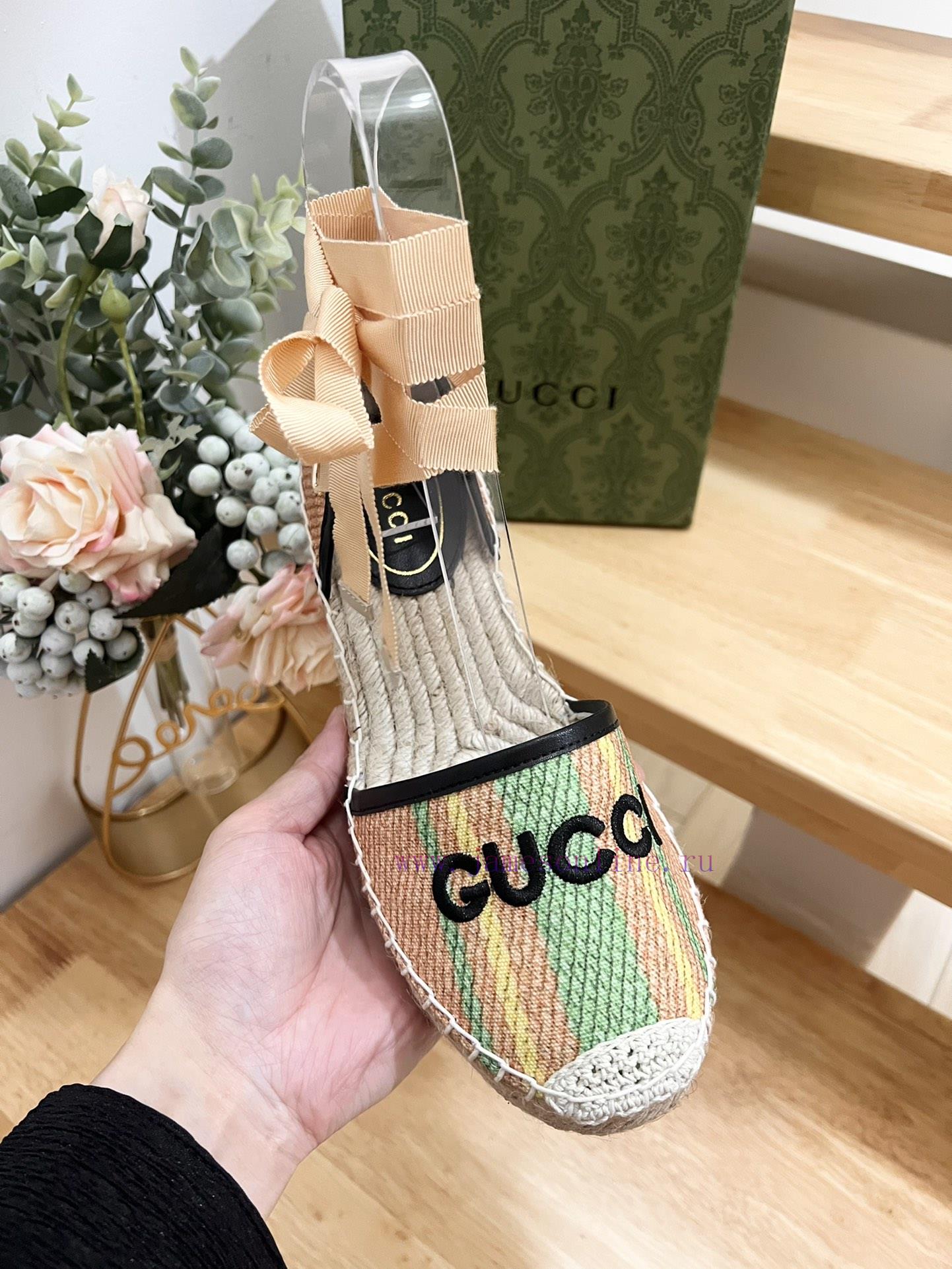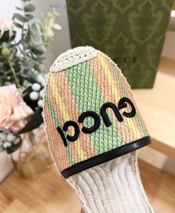 GUCCI 24ss early spring slope heel thick bottom GG Gucci pattern decoration garden head Gucci grass woven new fisherman decorationMs.Green and yellow striped primary color juteBlack leather with rolled edgesGucci logo embroideryRope woven rubber soleCode 35-41