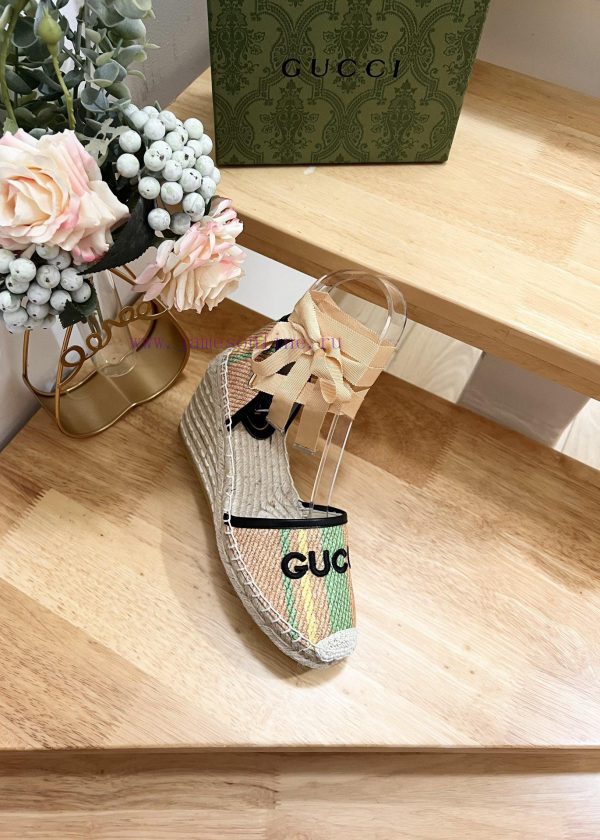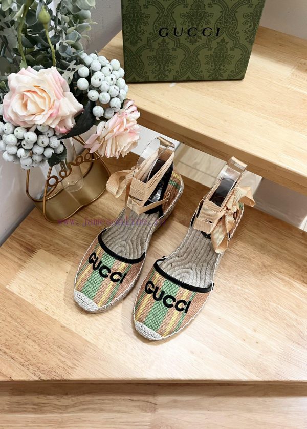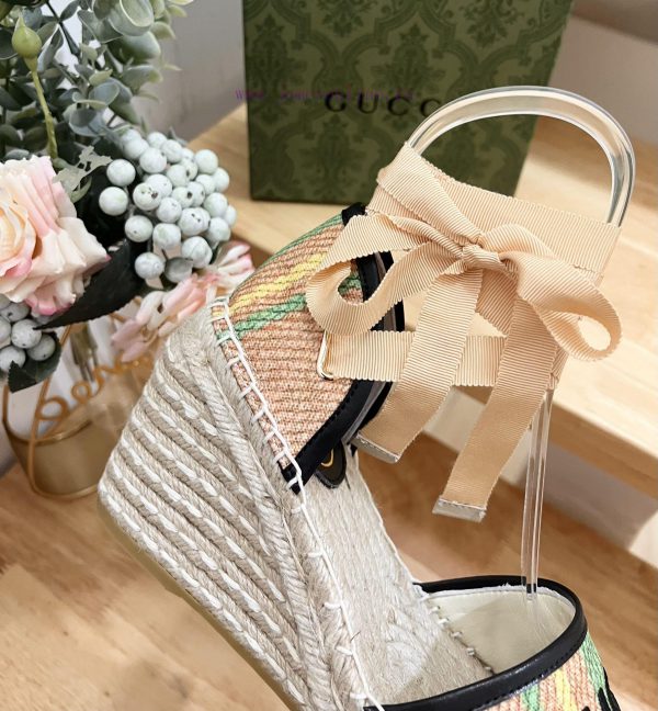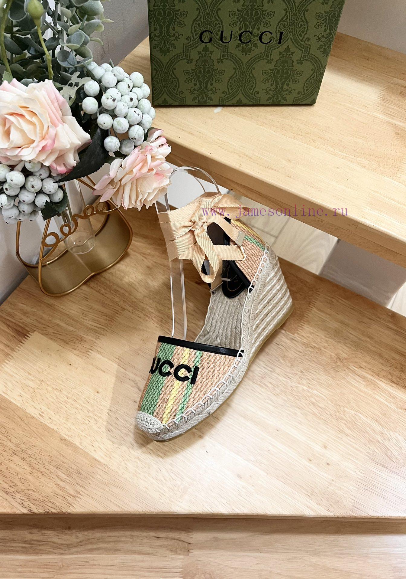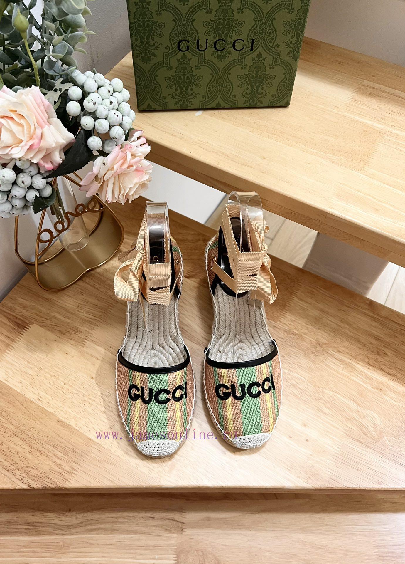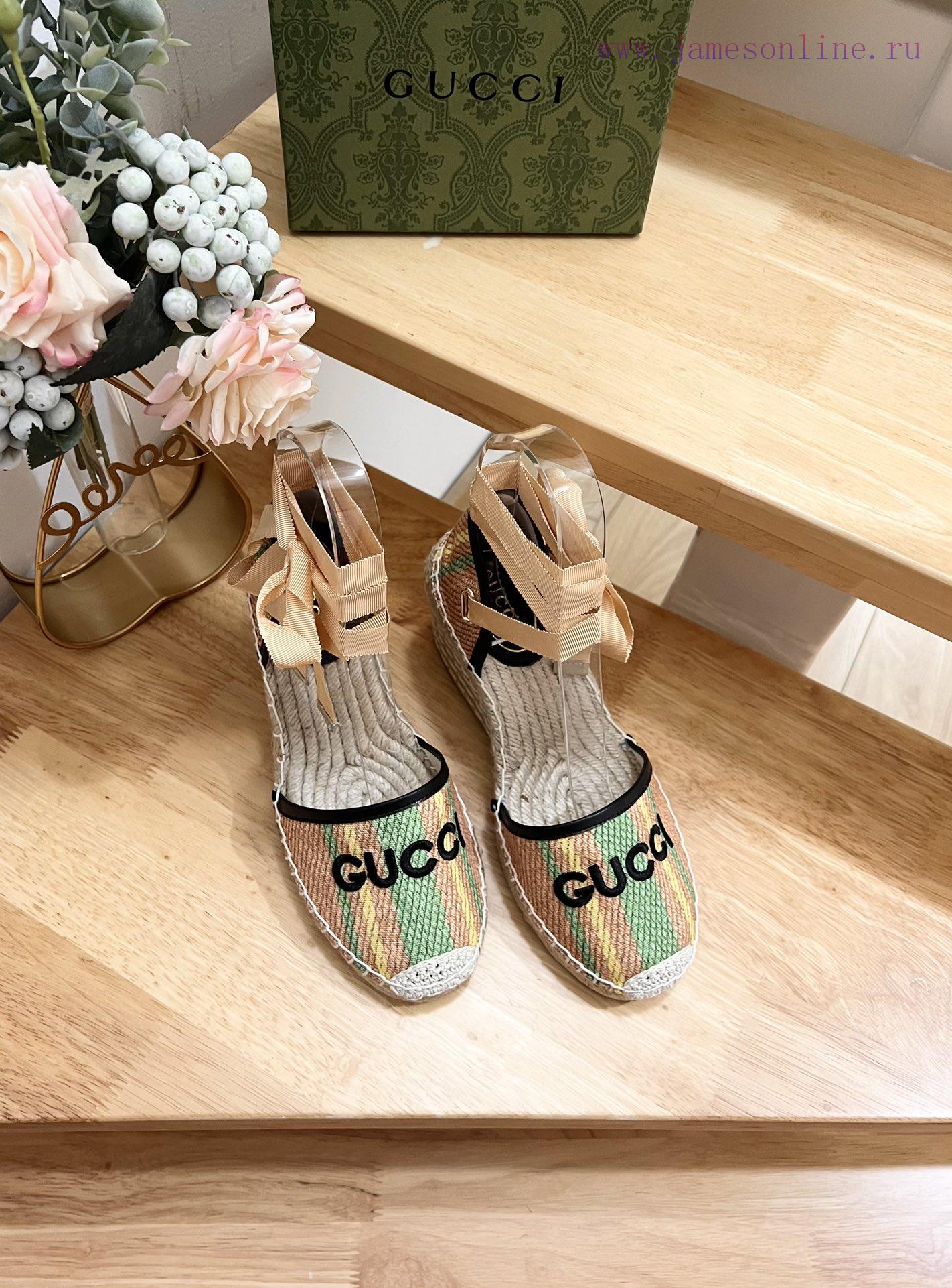GUCCI 24ss early spring slope heel thick bottom GG Gucci pattern decoration garden head Gucci grass woven new fisherman decorationMs.Green and yellow striped primary color juteBlack leather with rolled edgesGucci logo embroideryRope woven rubber soleCode 35-41
