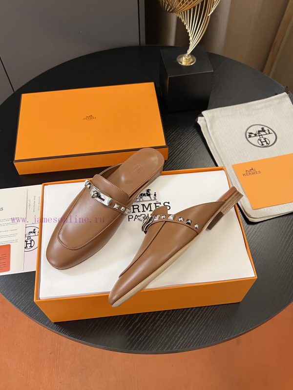 Hermes classic Kelly Muller half drag, with a custom-made calf leather upper and sheepskin insoles, a classic work. The rivet design is highly personalized with laser engraving, and the Italian leather outsole size is 34-42, 34, 41, 42. Customization is non refundable.