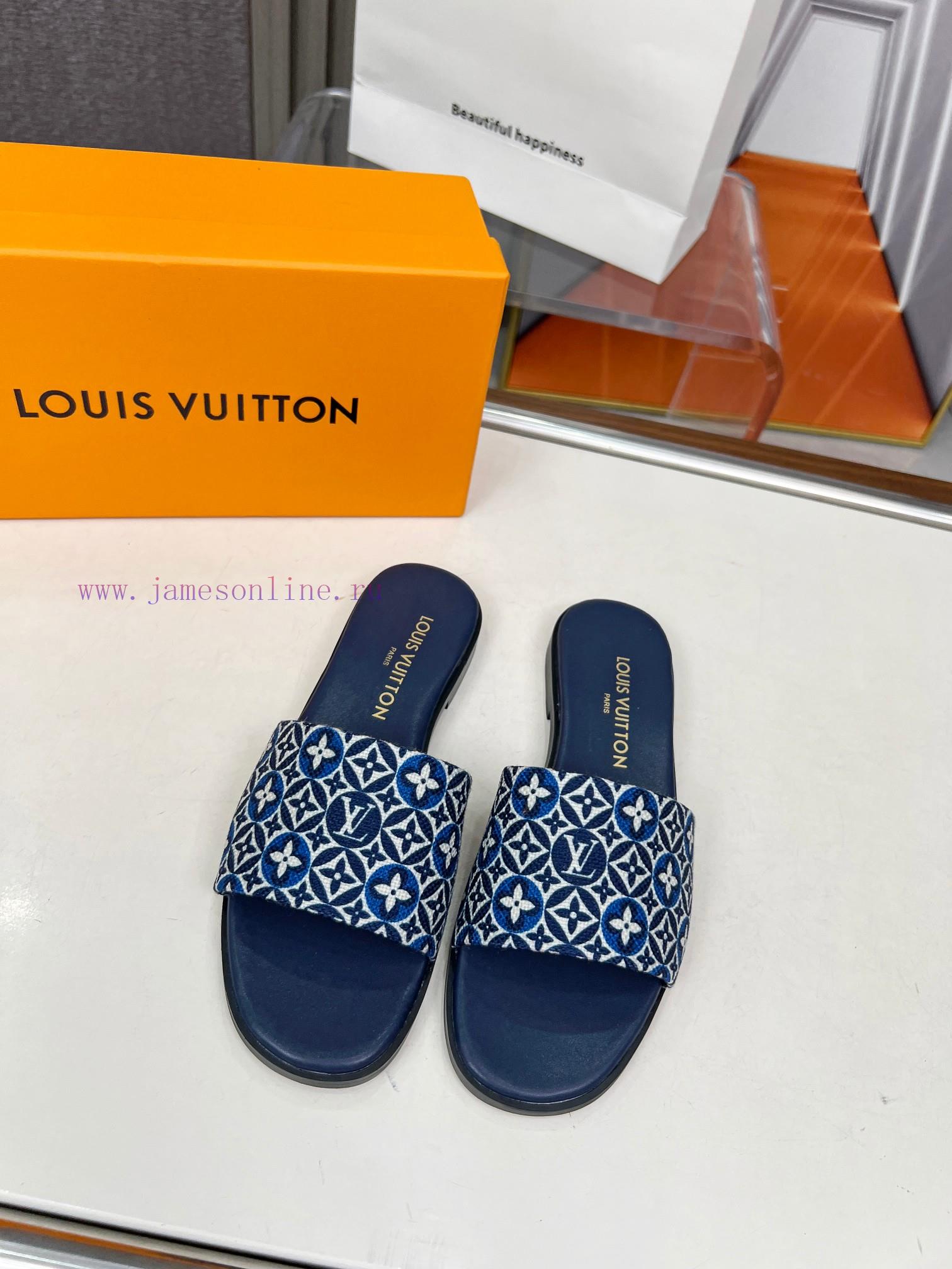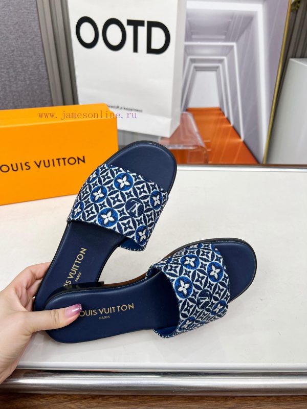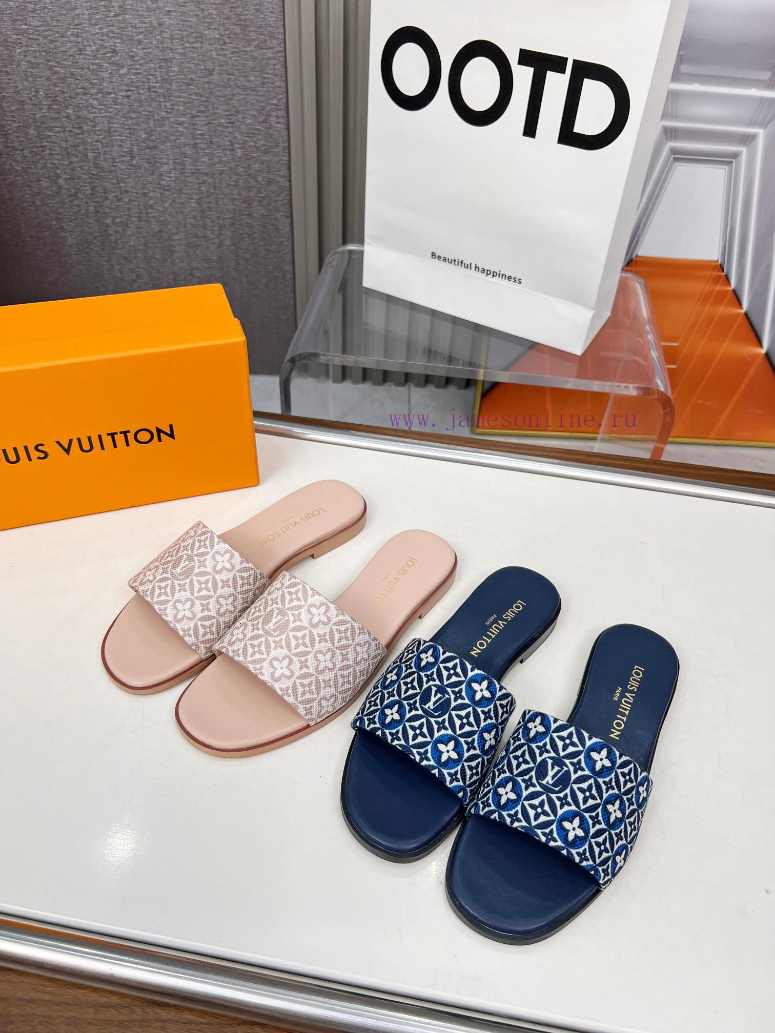 LV 2025 Spring/Summer New Lily Cool Trailer | A lazy and luxurious feeling at a glance****Summer must-have * * LV, these Lily flat bottomed sandals are really breathtakingly beautiful~▫️ ** Classic Louis Vuitton MONOGRAM denim fabric * *+embossed leather label * *, casual and high-end, perfect for pairing with jeans or skirts▫️ ** Soft leather sole+rubber shoe bed * *, feeling like stepping on clouds ️, walking for a day without tiring feet~▫️ Low key LV vintage logo, attention to detail, ecstatic. Wearing it out in summer, you can easily snap it into an Instagram style blockbuster**Small and fashionable without collision * *, sisters rushLV2025 Spring/Summer Flat Cool Dragging Lazy Gospel Luxury DressingColor Apricot BlueSizes 35-40 41424344 can be customized without return or exchange. Genuine leather sole can be customized with+40 non return or exchange