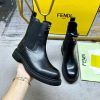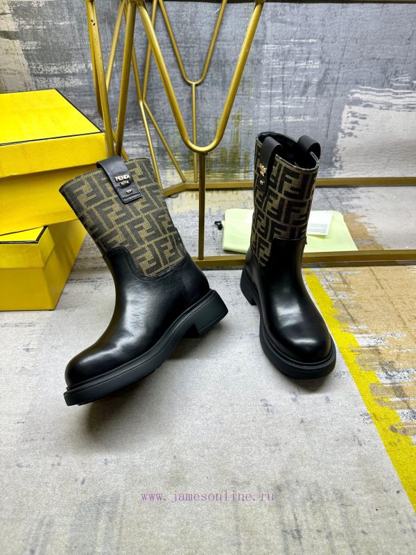 FENDI’s latest popular vintage mid length boots feature black cowhide paired with vintage fabric, metal clip details, sheepskin insoles, sizes 35-42,